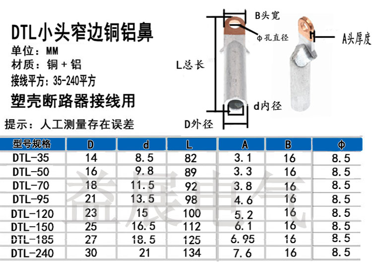 產品特點:小頭銅鼻子,小頭銅鋁線鼻子,是專為C45空開 斷路器定制的,能有效的解決普通銅鼻子太寬放不進去,用這款DTX小頭銅鼻子或者DTLX小頭銅鋁線鼻子就可以解決這個問題。具體產品尺寸和特點請于我公司人員聯系。